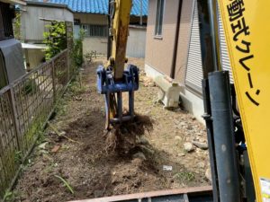 小型重機を使って、根からしっかりと樹木を撤去。地中の根も丁寧に処理し、再発芽を防ぎます。