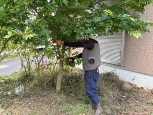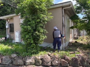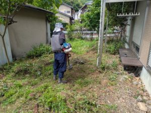 次に、背丈まで伸びていた雑草を機械と手作業で丁寧に除草。住宅まわりの見通しが一気によくなり、防犯・防虫対策にもなりました。